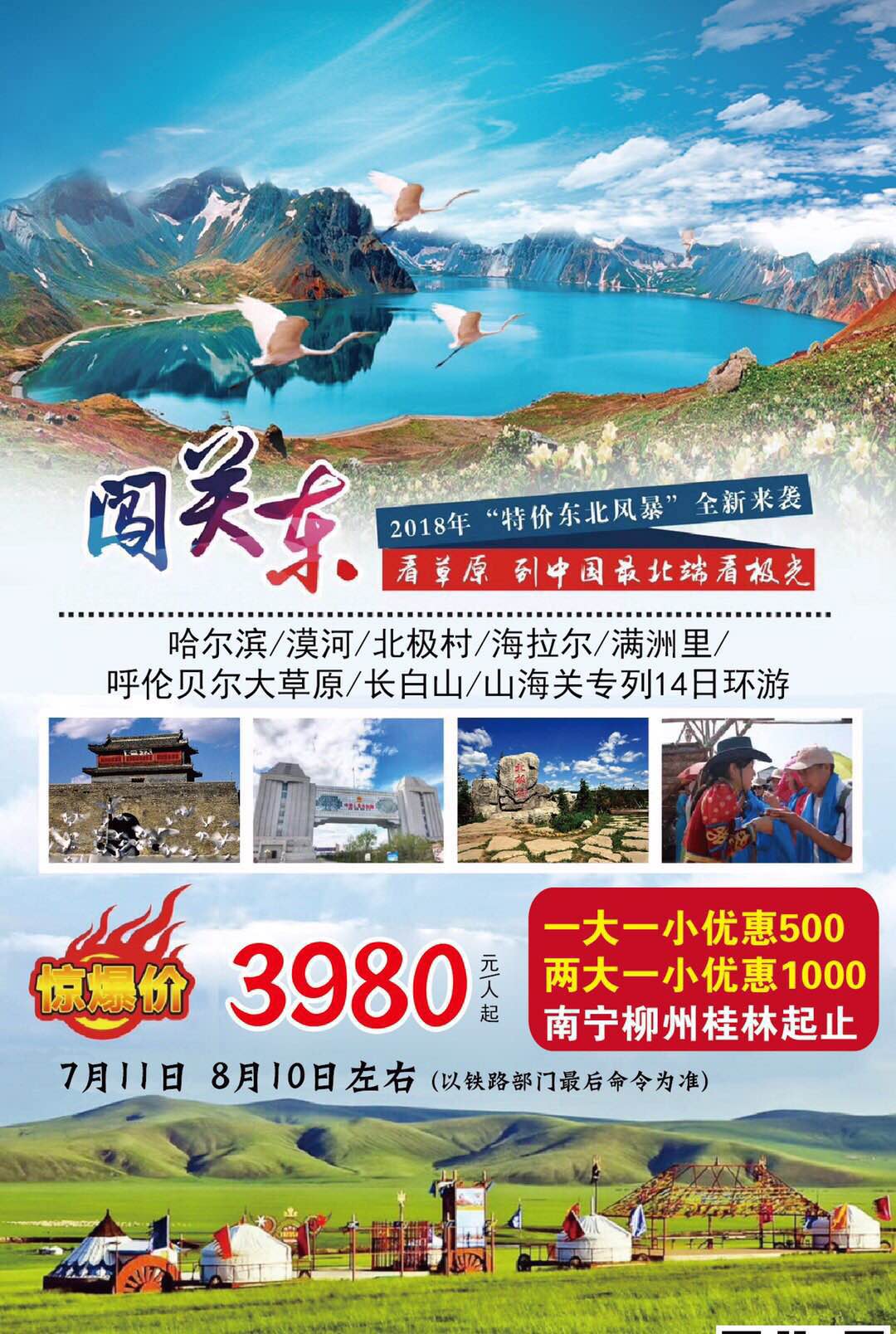 黑龙江(哈尔滨/漠河/北极村)、内蒙古(海拉尔/满洲里/国门景区/呼伦贝尔大草原)、吉林(长白山)、河北(北戴河/山海关)专列14日环游