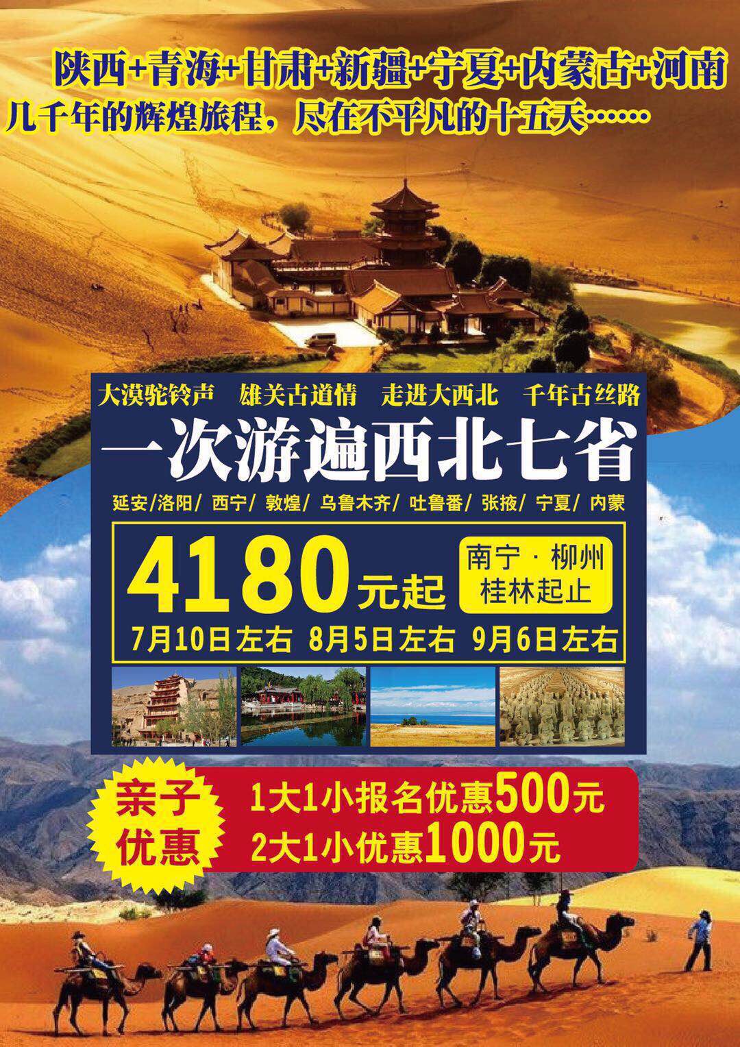 陕西(延安/宝塔山/梁家河)、河南(龙门石窟/关林)、青海(青海湖/塔尔寺)、甘肃(敦煌莫高窟/鸣沙山/月牙泉/张掖彩色丹霞)、新疆(天山天池/大巴扎、吐鲁番交河故城/坎儿井/葡萄沟/千佛洞)、宁夏(沙坡头/黄河宫/高庙)、内蒙(通湖草原)专列15日环游